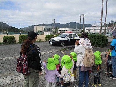 出発する前にパトカーの中からおまわりさんに手を振ってもらい、とても嬉しかった子どもたちです。