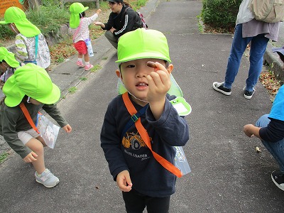 ドングリが落ちていたら、「ドングリ、コロコロ~🎵」と歌いながら拾ったり、触ったり。