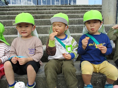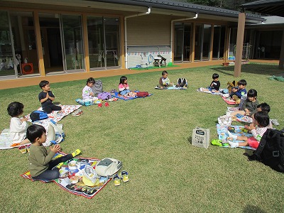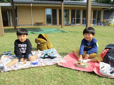 おうちの方の作ってくださったお弁当は、園に戻って園庭で食べました。とっても嬉しそうでした。