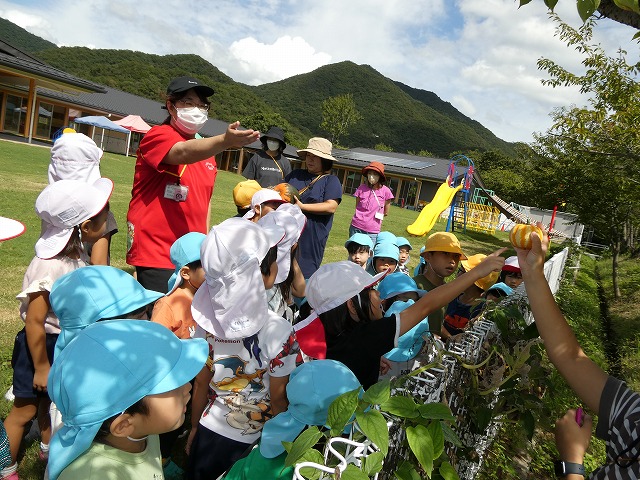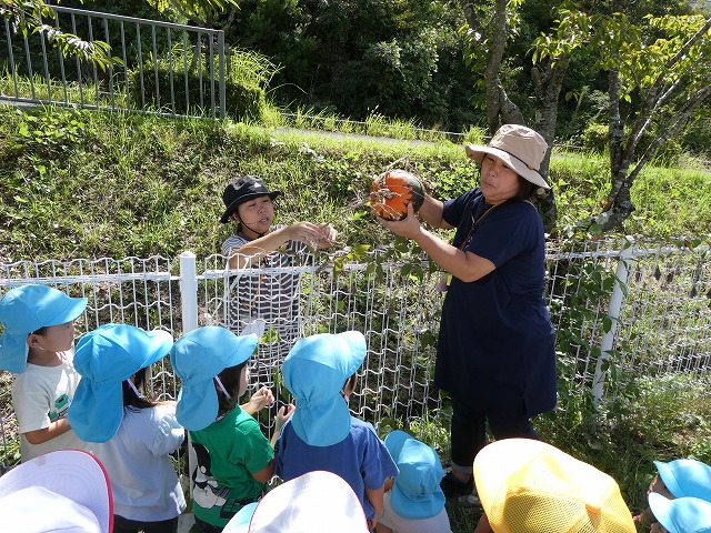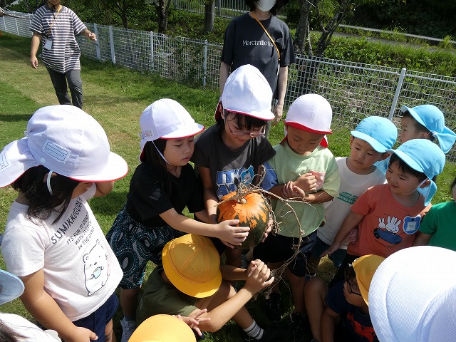 今日は、ぞう組&ばら組でかぼちゃの収穫をしたよ。