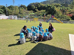 こども園に到着し、あたたかい園庭でさぎそうホールに行ったことの振り返りをしているぞう組の子どもたちです。