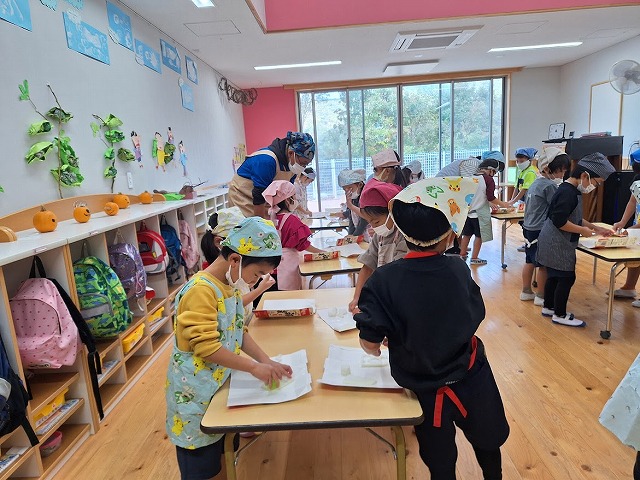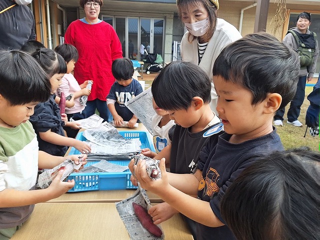 こども園のみんなは、サツマイモを洗って、新聞紙にくるみ、濡らしてアルミホイルで包みます。