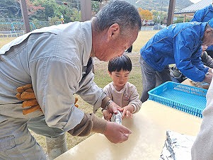 さくら組・ばら組のお友達は、サツマイモを焼いてもらっている間に豚汁作り。