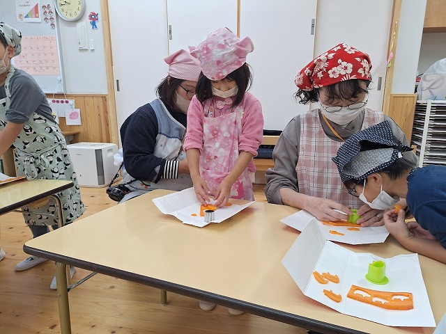 型抜きで、大根や人参をハートや花の形にしたり、手で白菜やたまねぎをちぎったりしました。