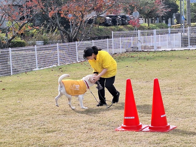 盲導犬協会の白いラブラドールの犬と、かわいいお姉さんです。