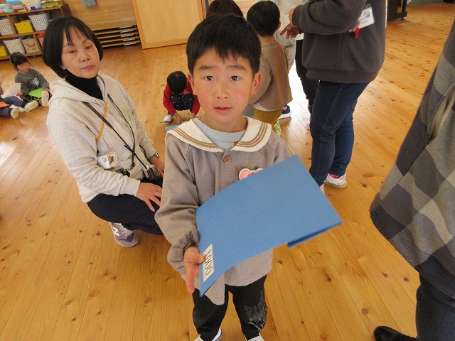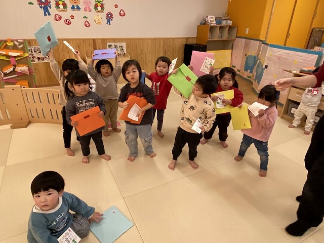 りす組は自分のマークシール、うさぎ組はお正月シールがはってあったので、