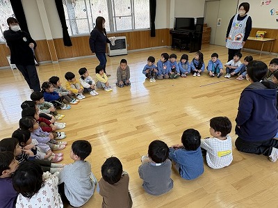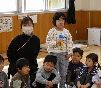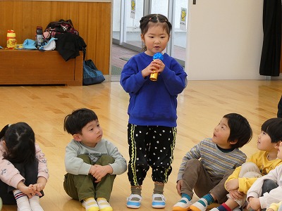 「はじまりの会」では、古市幼稚園のお友達の名前や好きなものを聞いたあと、こども園のみんなの自己紹介をしました。ちょっぴりドキドキしていた子もいましたが、しっかりと言うことができました。