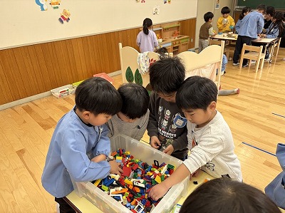 「一緒に遊ぼう~!」「遊び方教えてあげるわ!」と声をかけてもらったり、ブロックで難しい組み立てをお兄さんたちにしてもらったりして、ぞう組の子どもたちもとっても嬉しそうでした。