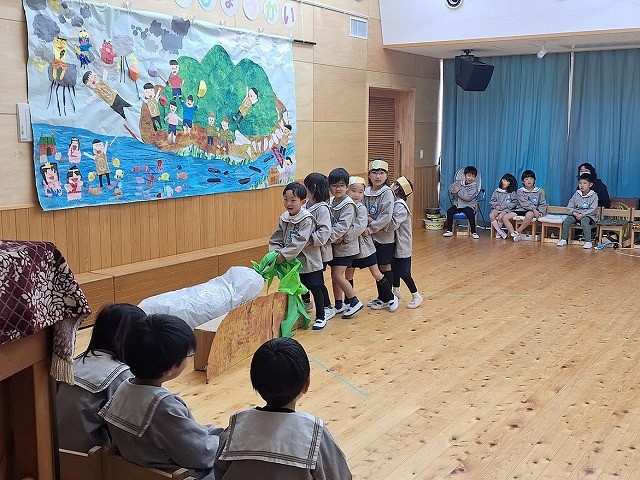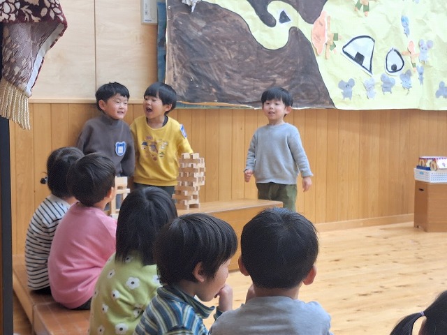 ぞう組は、《おむすびころりん》のお話に、自分たちの経験してきたことや「楽しい!」と感じたことをたくさん盛り込み、子どもたちの様々な表現が入った楽しい🎵お話になっています。