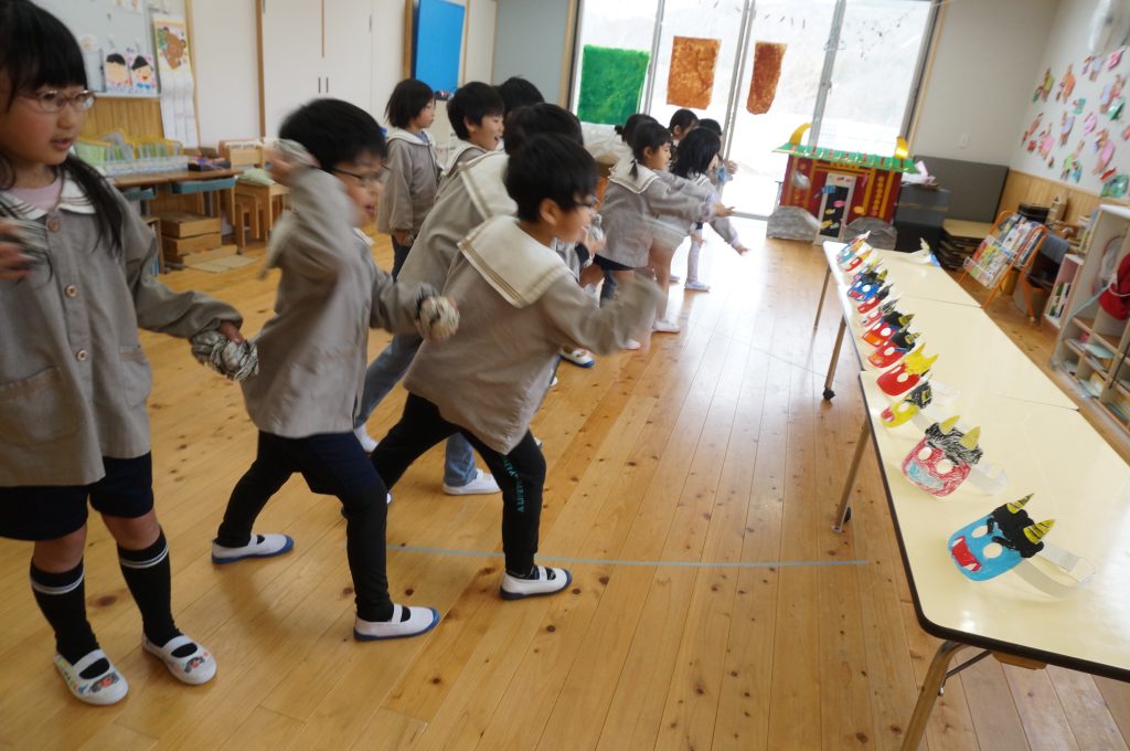 「すぐ泣くオニをやっつけるねん」「YouTubeばっかり見るオニ追い出すねん」と自分の中にいるオニを追い出したり。