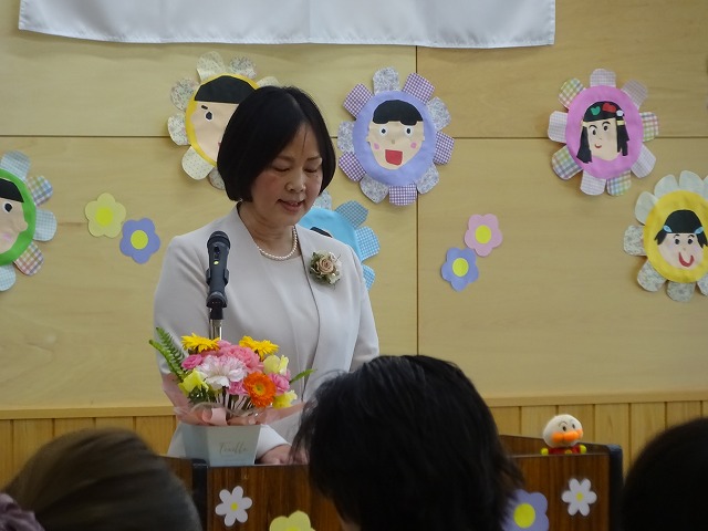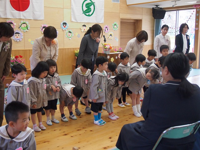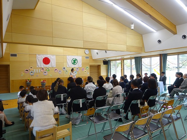 4,5歳のお兄さん、お姉さんたちがこども園の代表として、新しいお友達へのメッセージを伝えたり、歌を歌ったりしました。